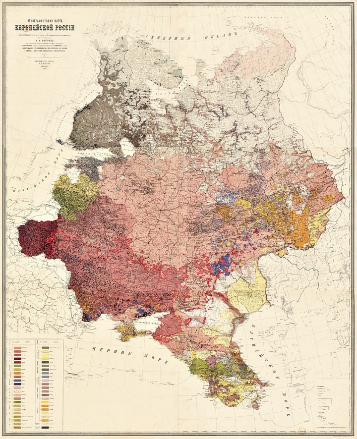 І от 1875 року Олександр Федорович Ріттіх, один з офіцерів Головного штабу російської імператорської армії, видав мапу, яка називається «Етнографічна карта європейської Росії». Причому слід сказати, що Ріттіх ніяк не був симпатиком української справи, навпаки — він видав окрему працю «История славян», де доводив, що всі слов’яни мають зрештою підкоритися «великорусскому народу» і «большому белому царю», і що Європа занепала у своїй сплячці, і «русский дух, русский мир» може надати їй додаткового поштовху. Ну, власне, те, що ми чуємо і сьогодні зі сходу — ті самі тексти, ті самі меседжи.